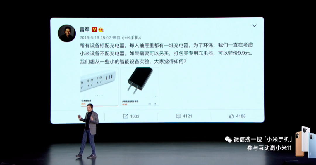 今天晚上,小米11发布会正式举行,而在发布会尚未举行的前两天,小米和雷军曾因在微博宣布小米11不附送充电器时引起轩然大波,当时雷军曾表示「有更好的解决方案」,今晚发布会终于正式揭晓,来看看大家是否满意~