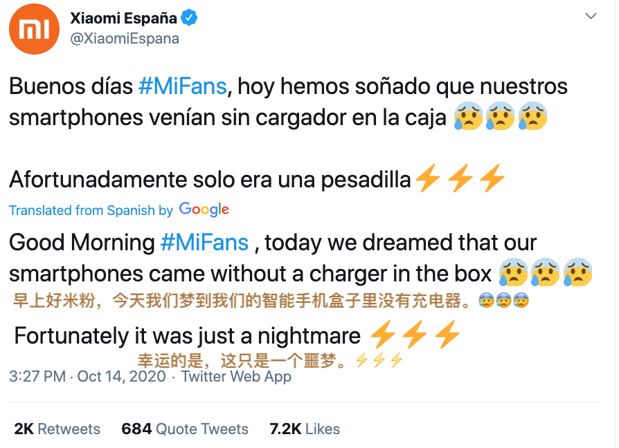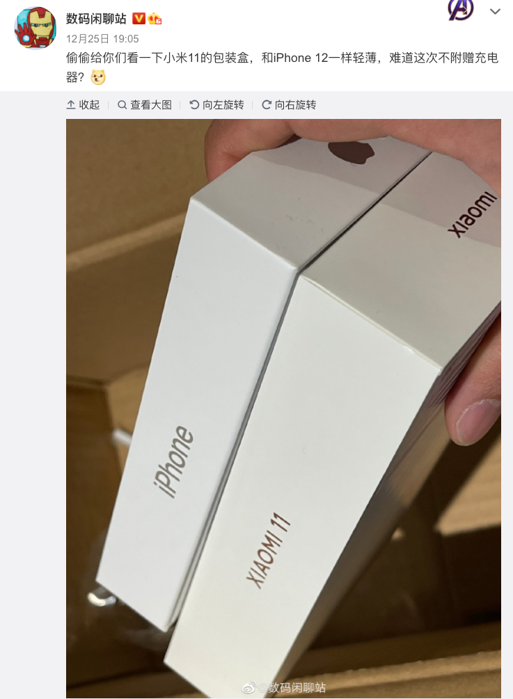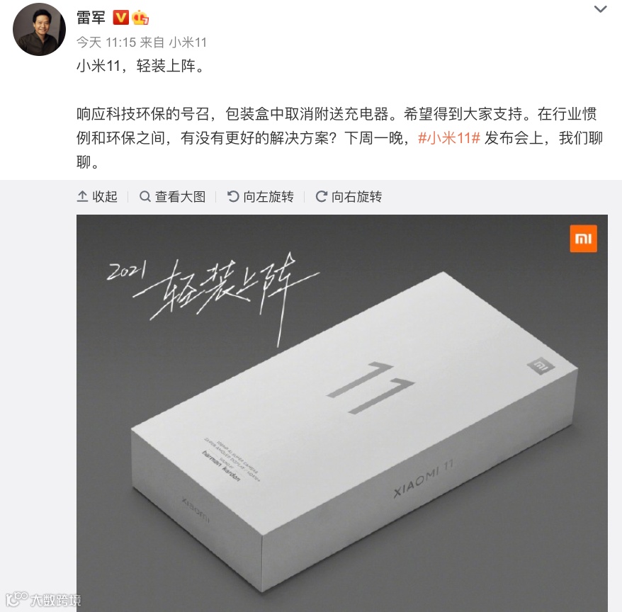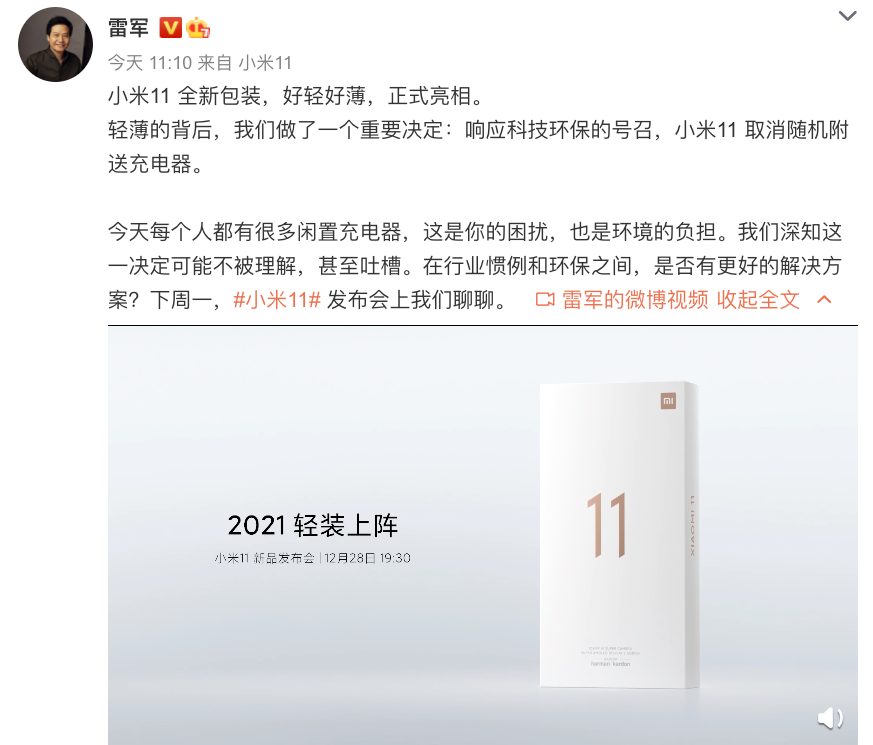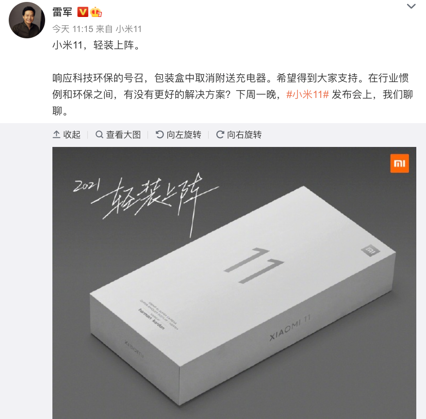 2020年10月 小米官方推特账号表示「将从欧洲开始,致力于使手机包装盒减少约60%的塑料包装」