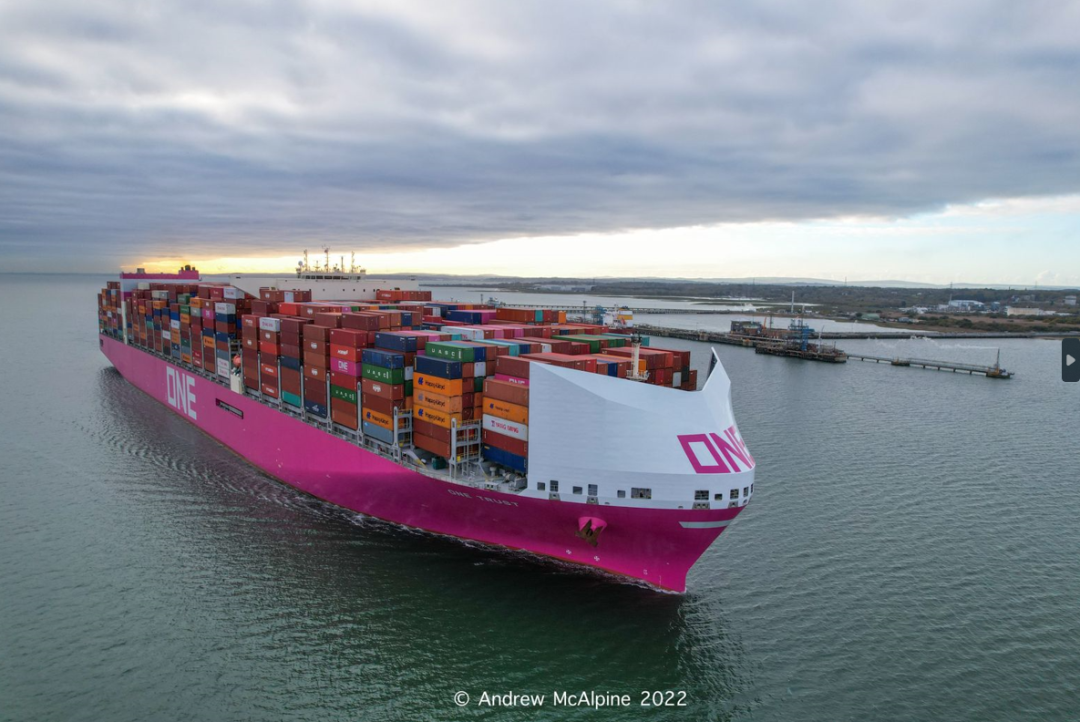 这艘20,170标准箱的集装箱船于2022年11月19日抵达南安普顿,挂靠的第一个北欧港口,船头安装了风罩。