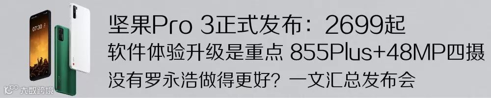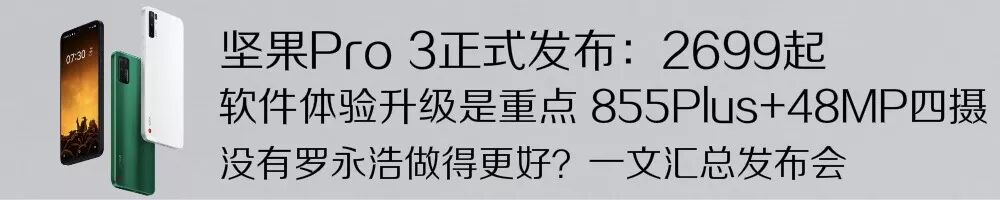 整理来说,其实坚果Pro 3的硬件表现不是特别出色,更多是OS UI软件体验上的升级,具体配置等图文版汇总戳蓝字2699起 坚果Pro3发布体验戳心 855Plus+48MP四摄 无老罗做更好?可以回顾~