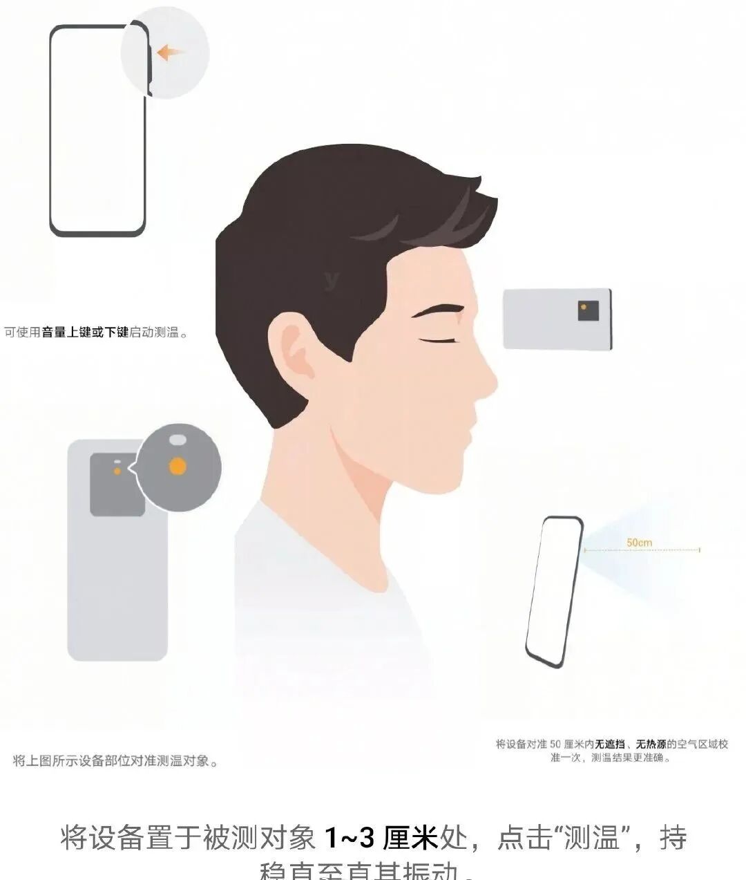 相关界面还放出了测温的演示图,从演示图来看,华为Mate 40 RS保时捷设计版后置相机模组 貌似采用居中矩形设计,其似乎有一颗专门的镜头用于测温,没记错的话,这也是继荣耀Play 4 Pro之后,第二款支持测温的手机。