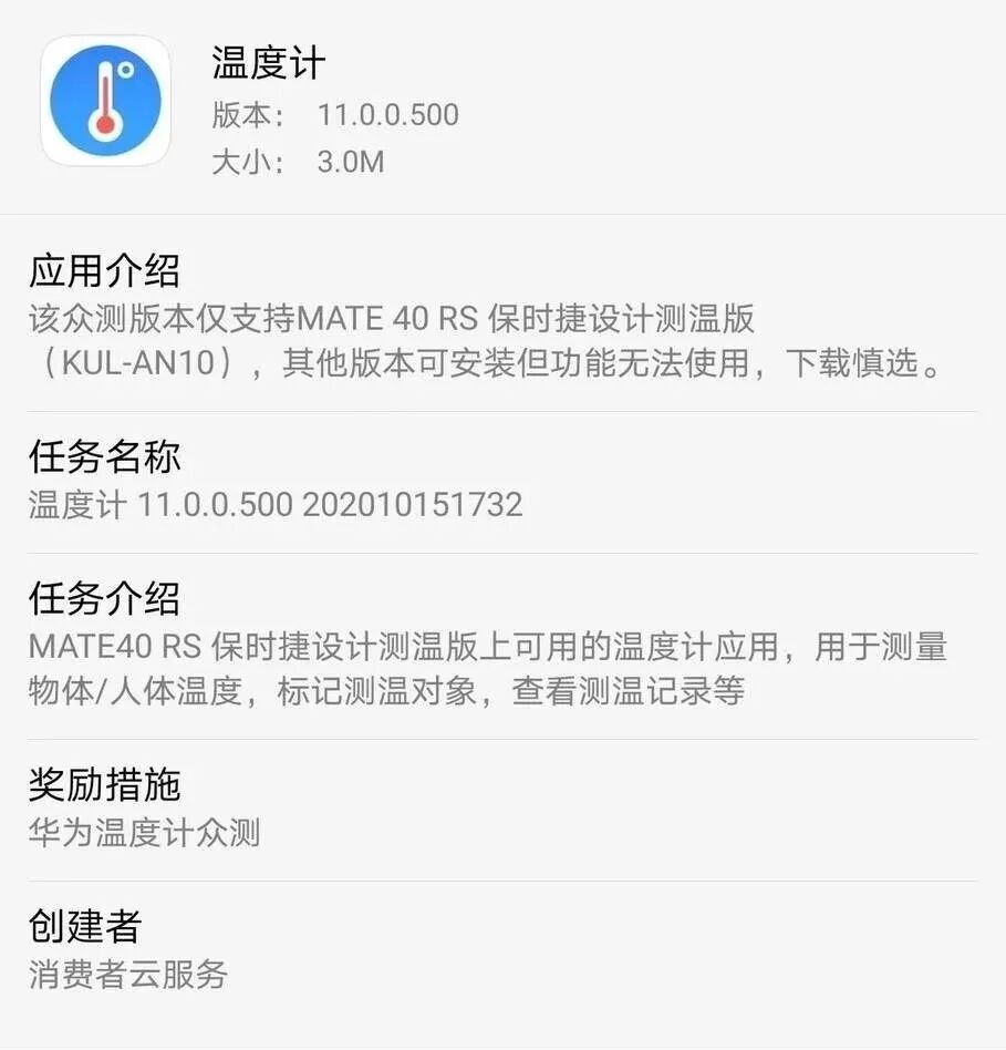 如上图所见,近日华为众测温度计App,有网友晒出截图表示该应用明确介绍称“该众测版本仅支持华为Mate 40 RS保时捷设计测温版,型号为KUL-AN10,用于测量物体/人体温度,标记测温对象,查看测温记录等”
