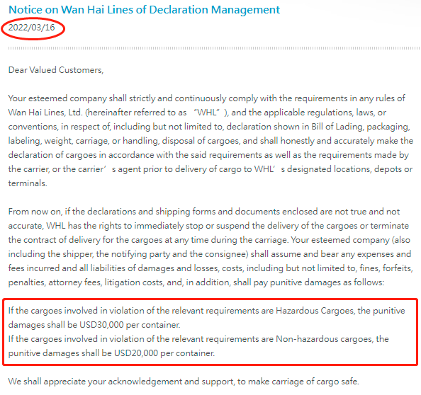 3月18日,万海航运发布公告称,客户应严格遵守万海航运(WHL)的任何规则以及适用的法律、法规或公约的要求,包括但不限于提单上的声明、包装、标签、重量、运输或货物的处理、处置,并应在将货物交付至WHL指定地点、仓库或码头之前,按照上述要求以及承运人或承运代理人的要求,如实、准确地申报货物。