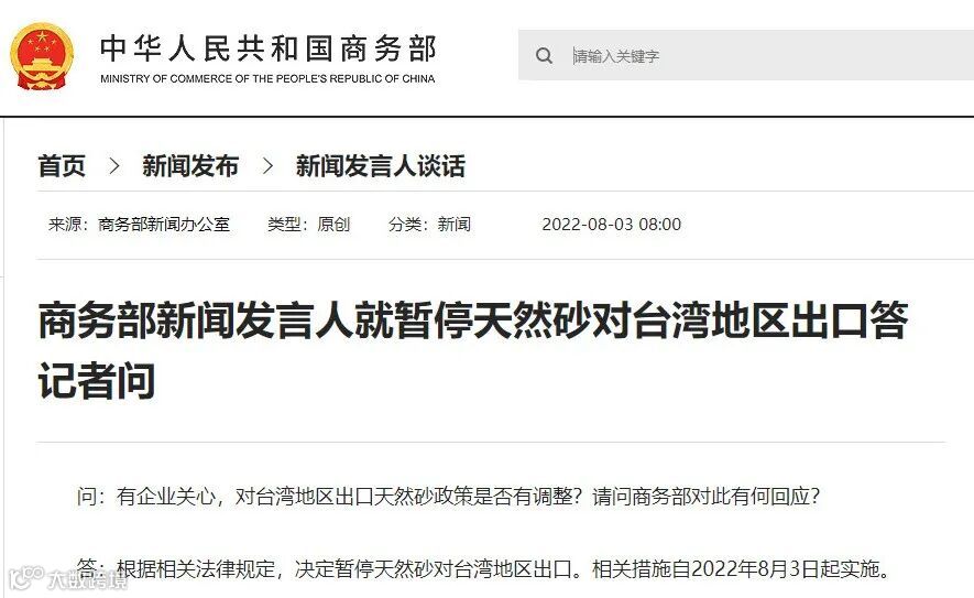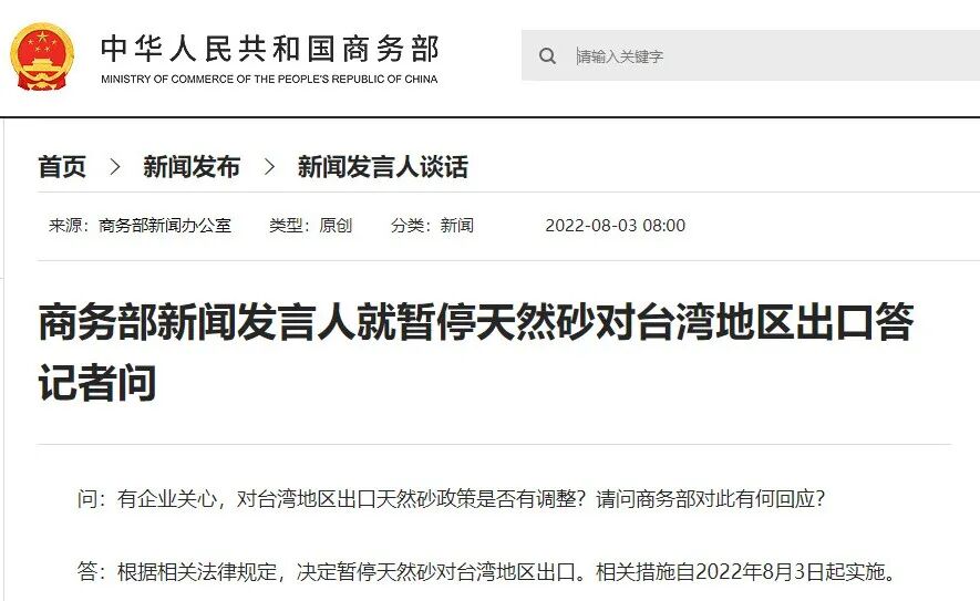 此外,商务部新闻发言人表示,根据相关法律规定,决定暂停天然砂对台湾地区出口。相关措施自2022年8月3日起实施。