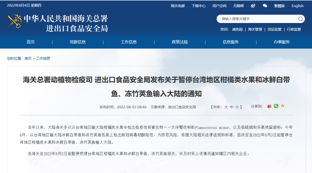 8月3日,海关总署动植物检疫司、进出口食品安全局发布《关于暂停台湾地区柑橘类水果和冰鲜白带鱼、冻竹荚鱼输入大陆的通知》。