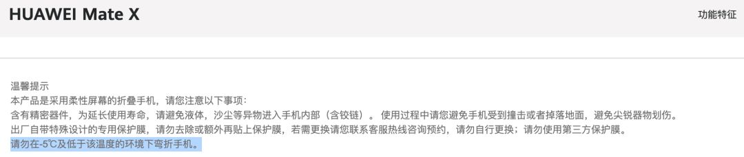 如上图所示,华为官网显示“本产品是采用柔性屏幕的折叠手机,请勿在-5℃及低于该温度的环境下弯折手机。” 零下五摄氏度及更低温度环境下,这让大冬天经常出现低温的北方用户心里懵B了,撞X还得看温度?