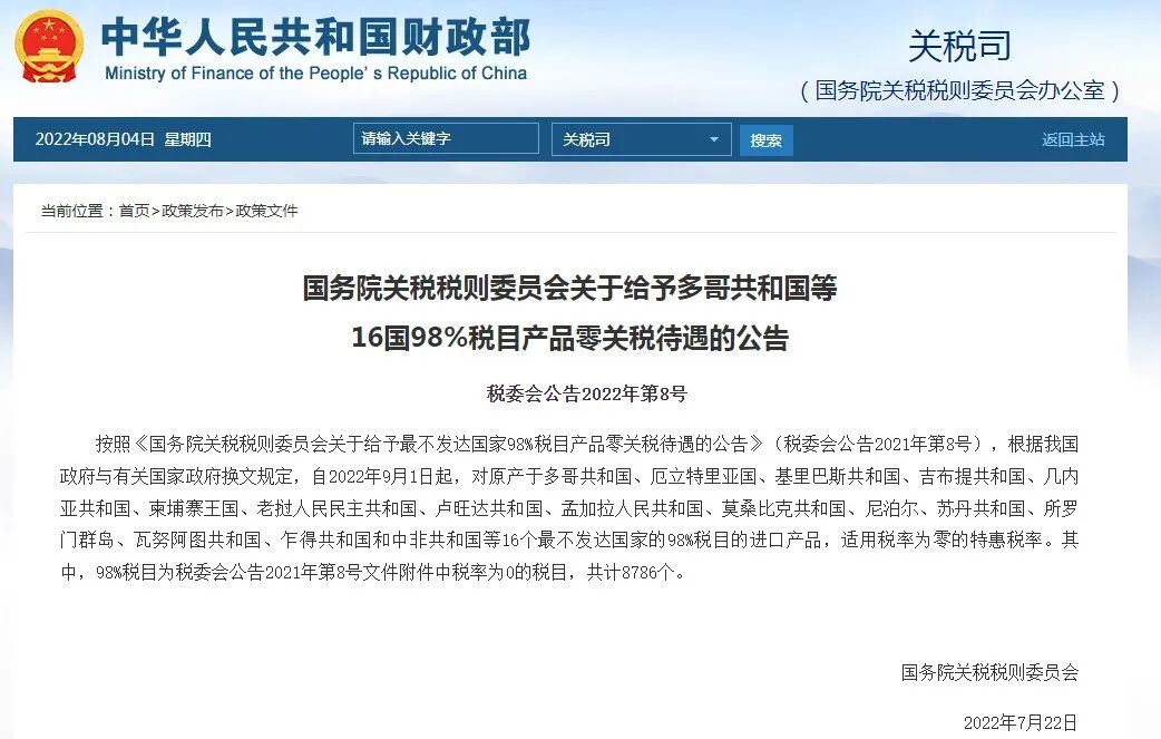 国务院关税税则委员会发布公告决定,按照《国务院关税税则委员会关于给予最不发达国家98%税目产品零关税待遇的公告》(税委会公告2021年第8号),根据我国政府与有关国家政府换文规定,