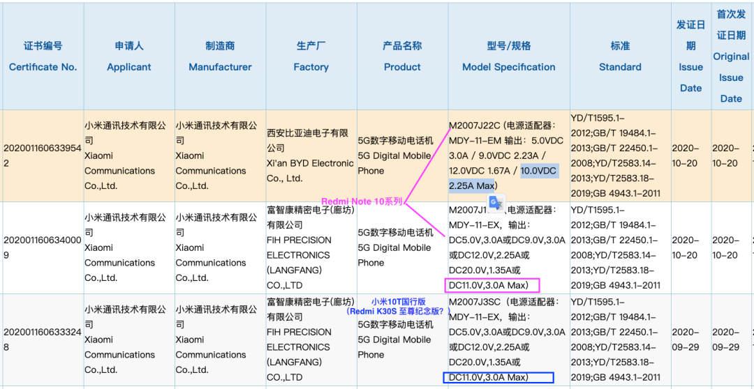 为避免大家混淆,前些天出现在3C认证的两款小米5G新机型号为 M2007J22C 和 M2007J17C ,分别配备 22.5W 和 33W 快充,这两款机型分别对应 Redmi Note 10 和 Redmi Note 10 Pro。