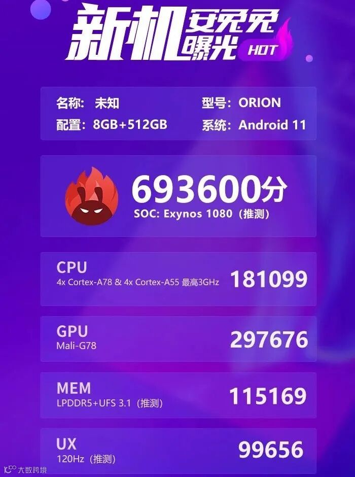 早前安兔兔也披露了三星Exynos 1080的跑分,表示这颗SoC八核CPU为 4*A78 + 4*A55(主频最高3Ghz),GPU 为 Mali-G78 ,综合跑分 693600 分,超小白实测的865和865Plus。(作为补充,小白测评数据库目前实测安卓机型安兔兔跑分最高是Redmi K30S至尊版的67W+)