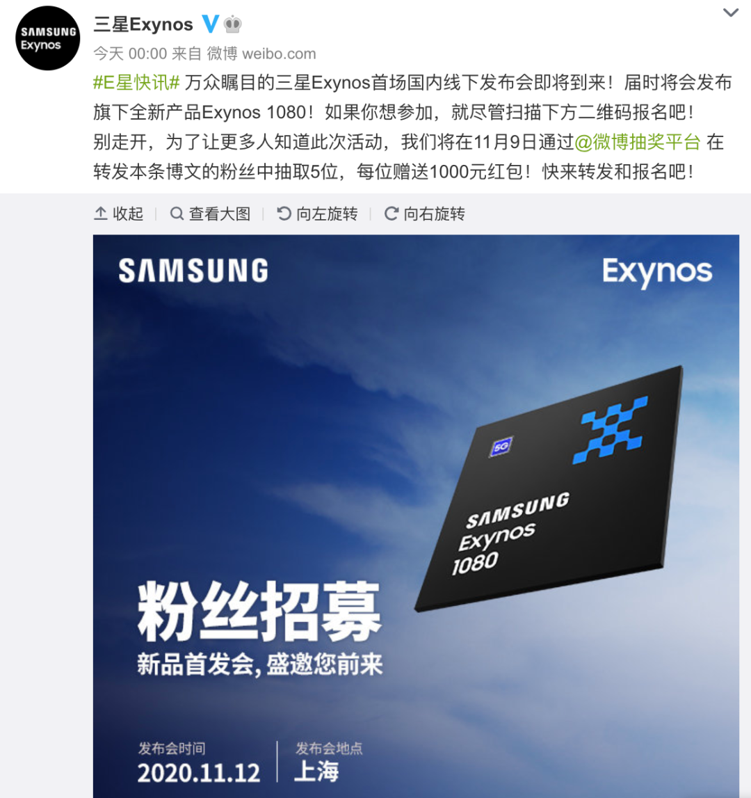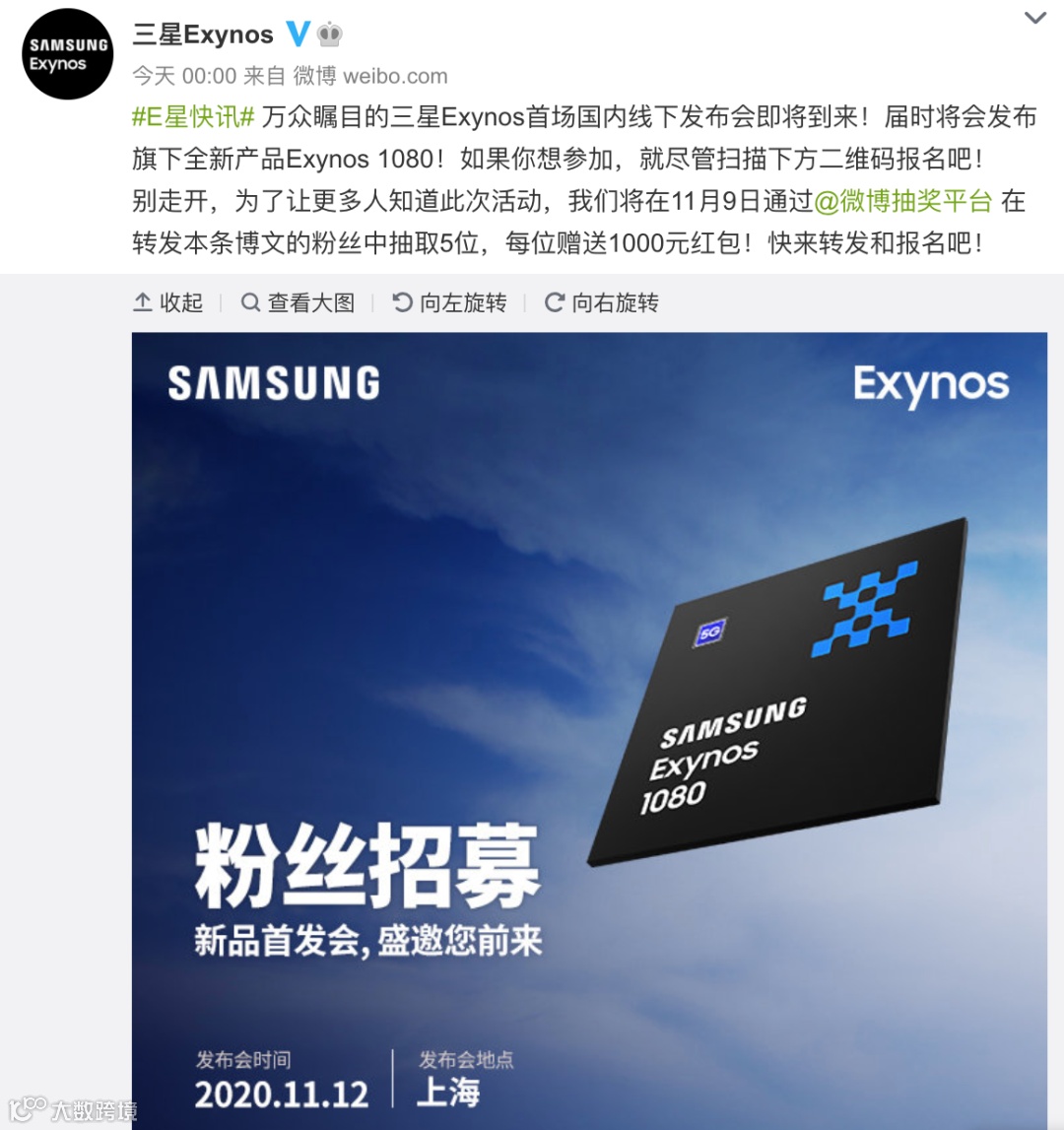 日前苹果A14和麒麟9000系列正式发布,这两家均基于最新的5nm工艺,也是旗舰芯,转眼间三星基于5nm的中端U却先来了,它就是三星Exynos 1080,这颗SoC早前就已经有不少曝光消息,但今日凌晨官方正式宣布其将于11月12日在上海正式发布。