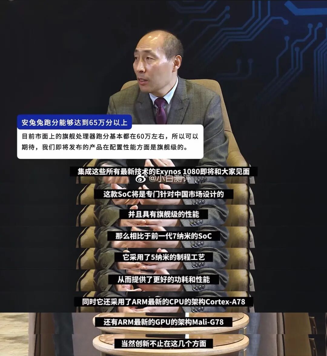规格上,早前三星曾在高管访谈中预热:全新三星 Exynos 1080 处理器即将发布,基于 5nm 工艺制程,CPU 采用 ARM 最新的Cortex-A78 架构,GPU 采用最新的 Mali-G78 架构,这款 SoC 是专门针对中国市场设计的,具有旗舰级性能,安兔兔跑分 65W+ 。