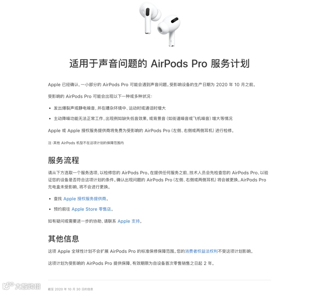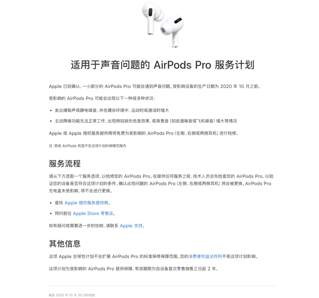 部分AirPodsPro出现声音问题,苹果官网昨晚发布公告,表示出现问题的用户#苹果免费更换部分AirPodsPro,受影响设备的生产日期为2020年10月之前。受影响的AirPods Pro可能会出现以下一种或多种状况: