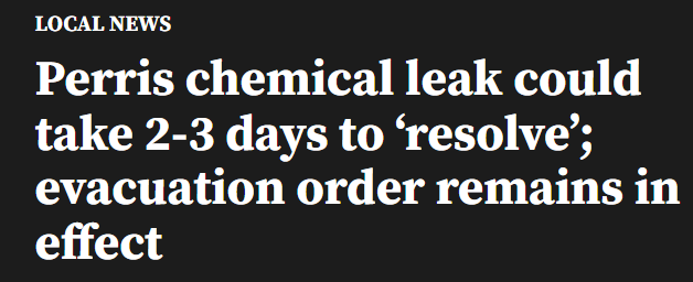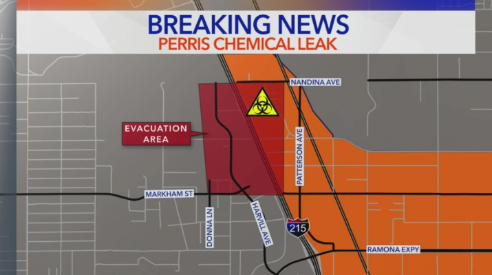 215高速公路两侧从范布伦大道(Van Buren Avenue)到拉莫纳高速公路( Ramona Expressway)也完全关闭。目前尚不清楚关闭将持续多久。据悉,前往佩里斯的Metrolink铁路服务也受到了泄漏的影响而无法通过该疏散区。
