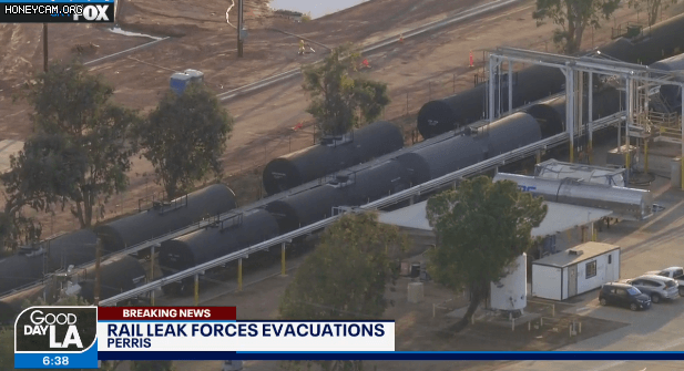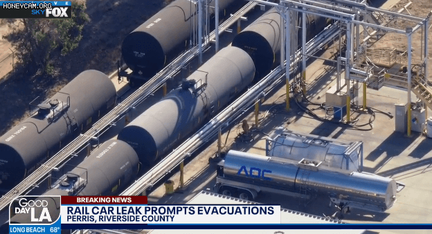 周五清晨,相关部门正在河滨县佩里斯(Perris)附近进行大规模调查。此前,一节火车油罐发生了化学品泄漏,并确定火车装载罐内的化学物质过热并可能随时爆炸。当地居民被强制疏散,
