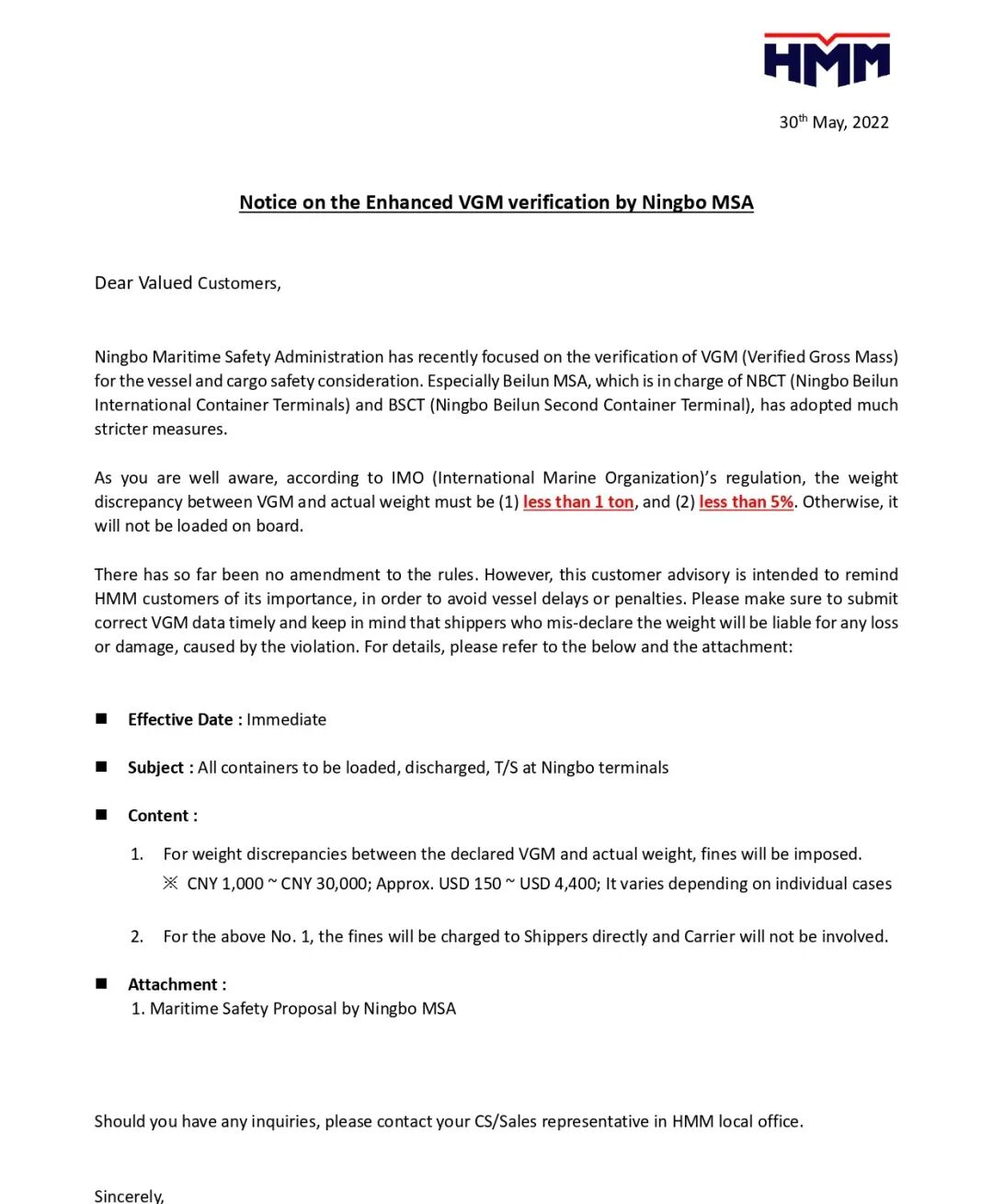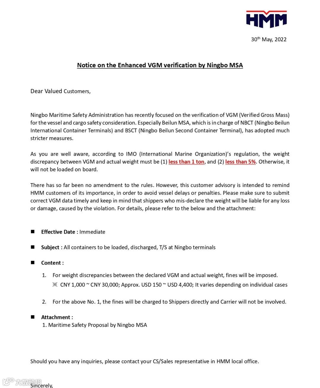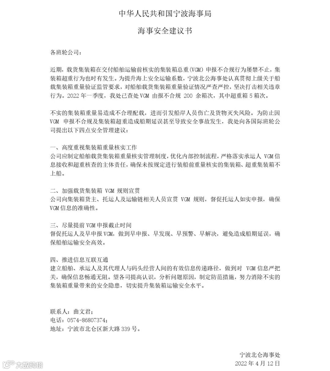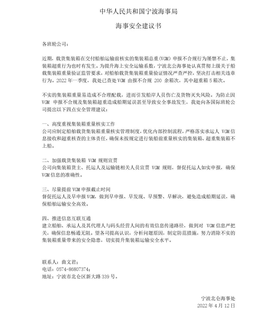 值得注意的是,船公司HMM5月30日也发布通知称,从船舶和货物的安全角度考虑,宁波海事局最近专注于VGM(Verified Gross Mass)的验证。尤其是主管NBCT(宁波北仑国际集装箱码头)和BSCT(宁波北仑第二集装箱码头)的北仑海事局采取了更为严格的措施。