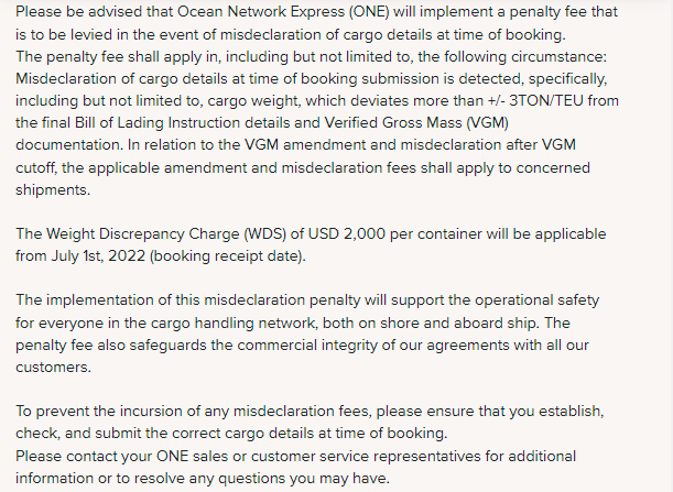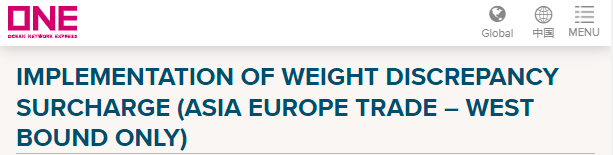 船公司海洋网联(ONE)发布实施征收集装箱重量差异附加费通知,ONE指出,该费用将在亚欧航线实施,仅限西行航线。请注意,如果在订舱时错误申报货物详细信息,海洋网联(ONE)将征收罚款。