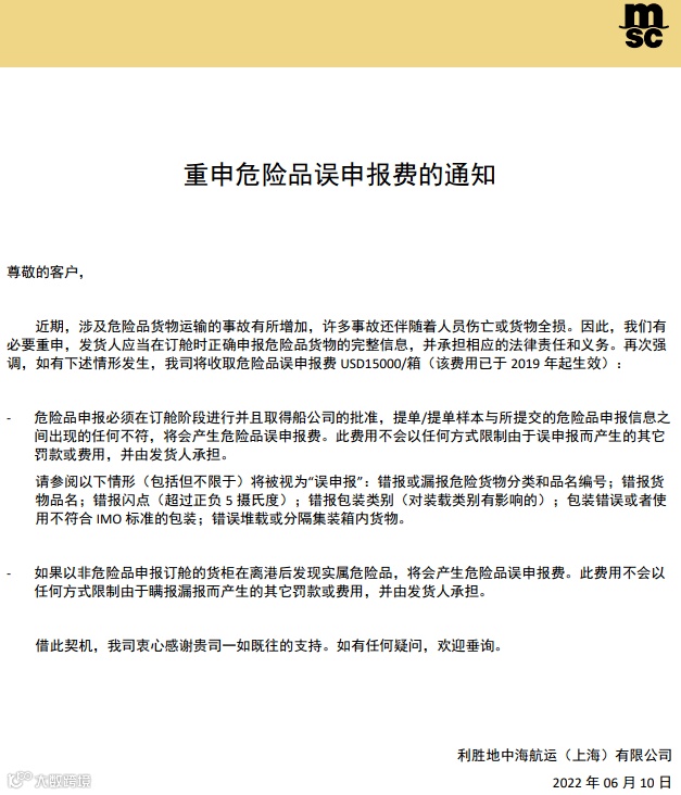 日前,地中海航运MSC发布公告称,涉及危险品货物运输的事故有所增加,并重申发货人应当在订舱时正确申报危险品货物的完整信息,并承担相应的法律责任和义务。对提单/提单样本与所提交的危险品申报信息之间出现的任何不符,将会产生危险品误申报费。MSC将收取USD15000/箱的危险品误申报费。