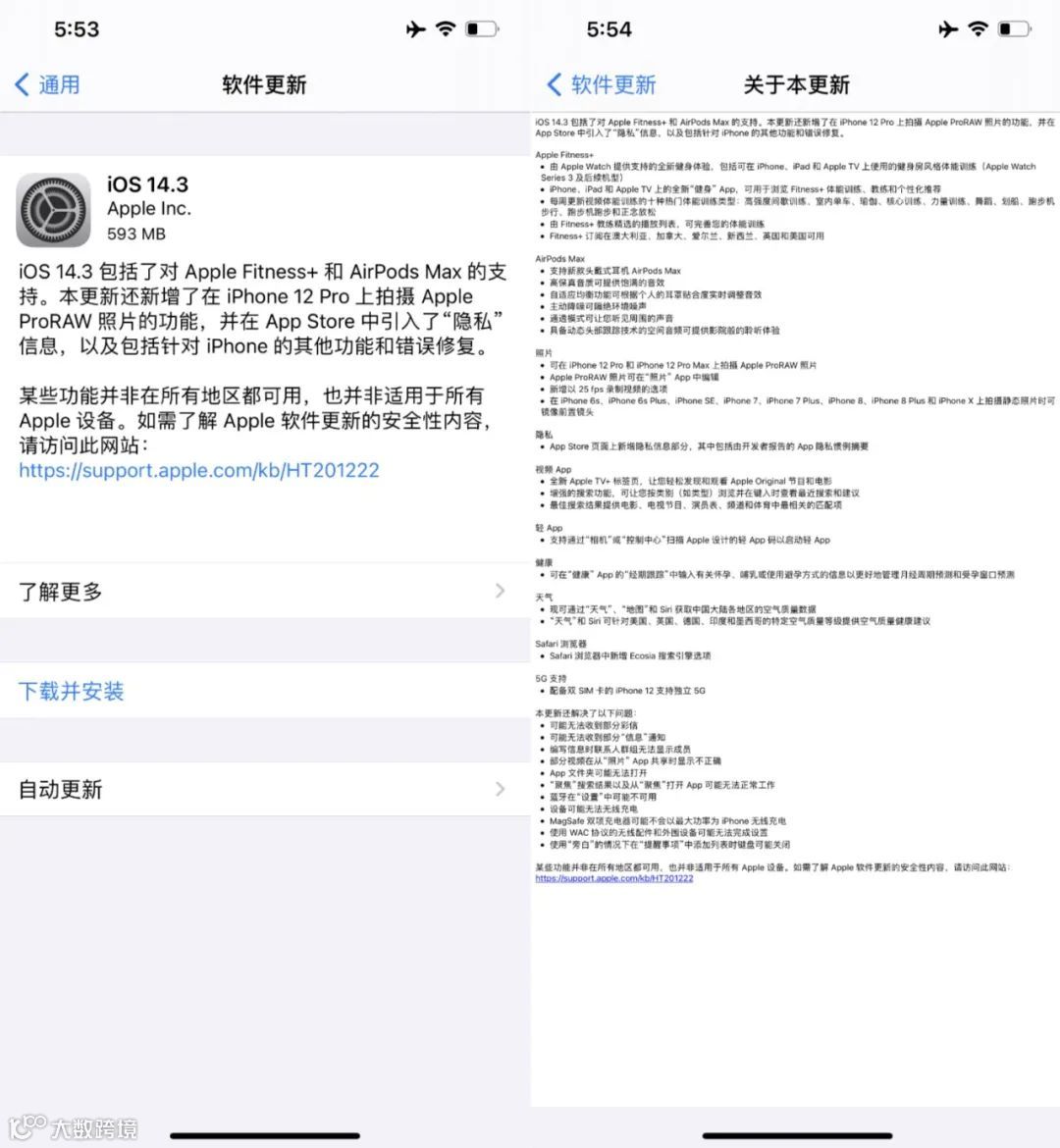 今天凌晨,苹果正式推送了iOS 14.3、iPadOS 14.3,不仅新增对Apple Fitness+和AirPods Max的支持,同时还新增了iPhone 12 Pro上拍摄Apple ProRAW照片的功能。