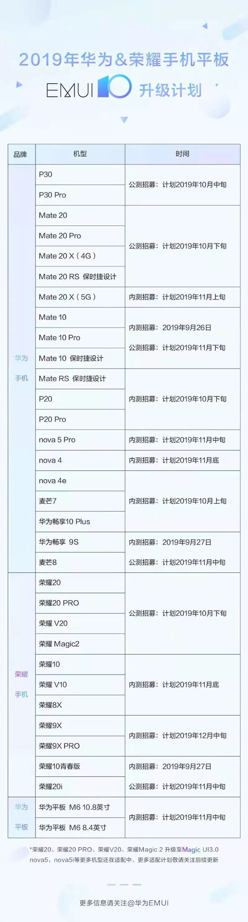 在今年8月9日,华为正式发布了基于Android 10的全新EMUI 10(戳蓝字即可回顾EMUI 10变化),目前EMUI 10也已经被华为Mate 30系列率先首发,官方随后公布了其他机型的具体推送时间,具体看下图: