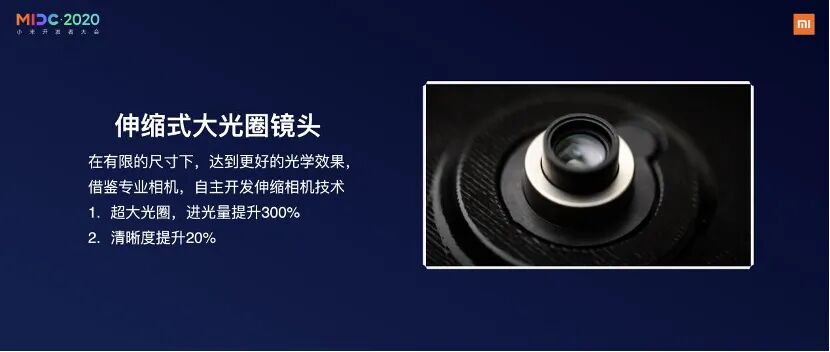 最后是小米这边的消息,今天MIDC 2020小米开发者大会正式开幕,大会将持续三天,今天大会第一天,小米公布了不少新动作,在相机方面还带来了「伸缩式大光圈镜头」。