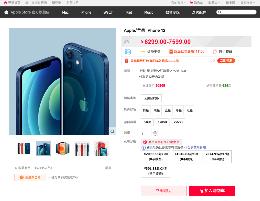 细节上值得注意的是,苹果天猫旗舰店还显示,合计约62951台iPhone 12系列(参与双十一期间的花呗12期免息分期优惠活动),库存有限售完即止。所以之前那波下架确实有一丢丢可能是因为库存不够?