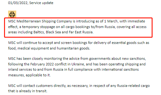 目前马士基已注意到事件对全球供应链的影响,例如货物在各中转枢纽的延误和扣留——总体上造成不可预测的运营影响。由于其业务的稳定性和安全性已经受到制裁的直接和间接影响,除食品、医疗和人道主义用品外,马士基将暂停海运、空运和洲际铁路往返俄罗斯的新预订。即日起(3月1日)执行,覆盖所有俄罗斯门户港口。随着计划的推进,马士基将在未来几天公布更多细节。