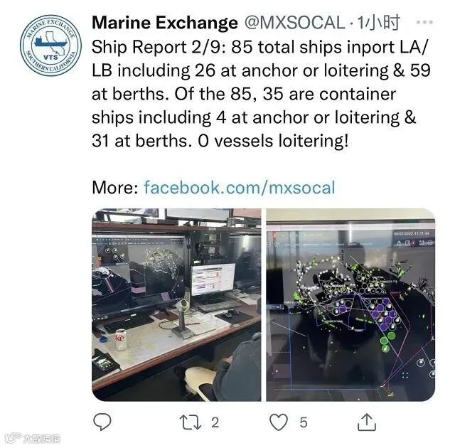 截至2月9日,美国南加利福尼亚州海运交易所数据显示,目前有85艘船在洛杉矶港和长滩港外停泊。