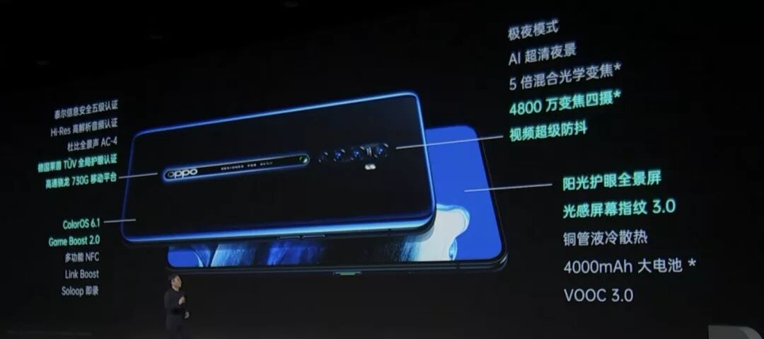 卖点方面,Reno 2后置四摄:索尼IMX586 4800万像素主摄,支持OIS光学防抖,1300万像素长焦镜头(可实现5倍混合光学变焦,最高20倍数码变焦)+800万像素116°超广角+200万胶片风格镜头,支持2.5cm微距,主打视频防抖。