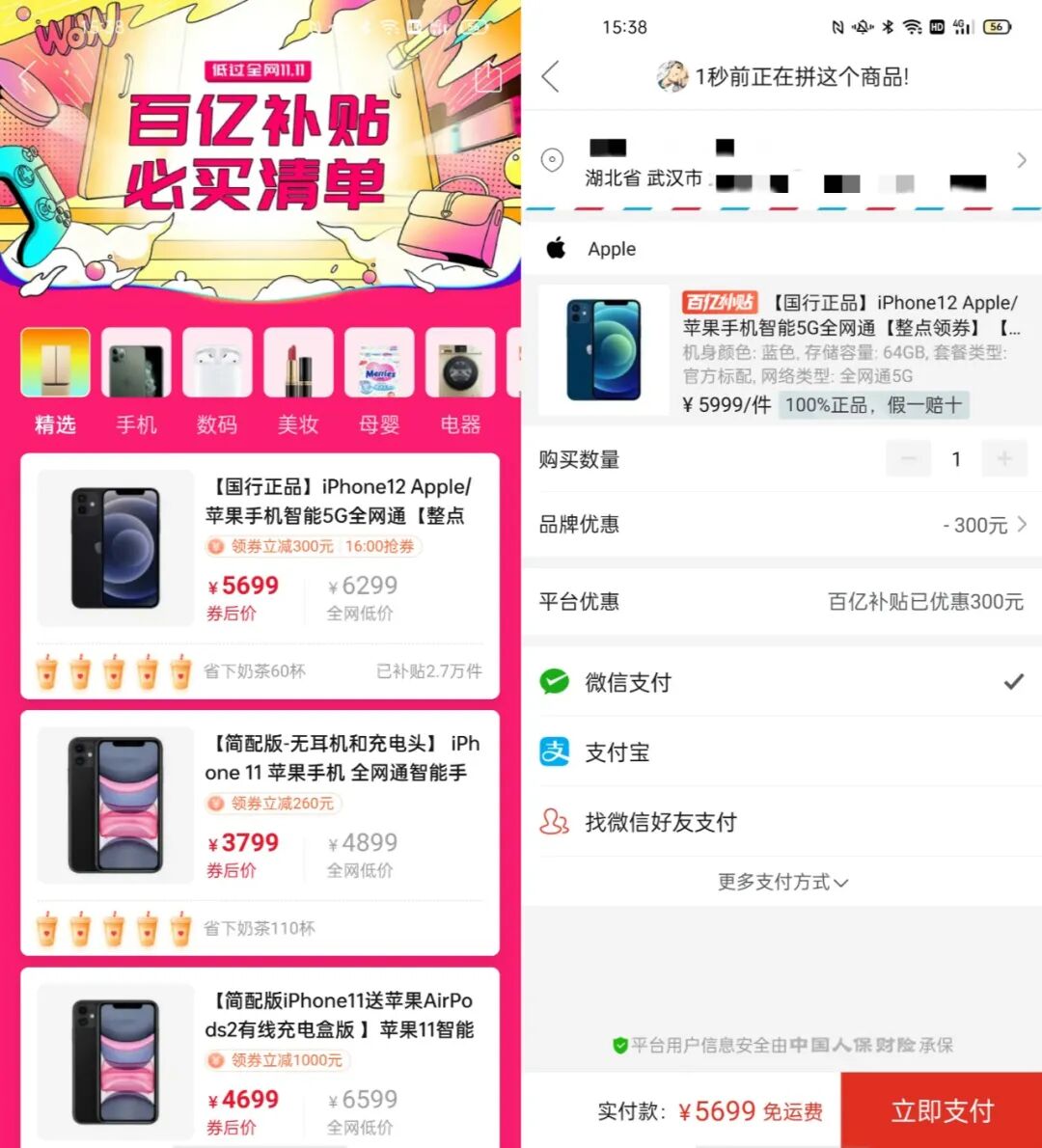 iPhone 12系列发布后外界一直很关注拼多多百亿补贴活动,但自预购日起拼多多苹果相关活动页面突然消失,外界纷纷猜测或许是与网传的苹果新品承诺函(苹果要求代理商、经销商禁止向拼多多等第三方店铺供货)有关。万万没想到昨晚iPhone 12突然出现在了拼多多百亿补贴活动里,直降600元。