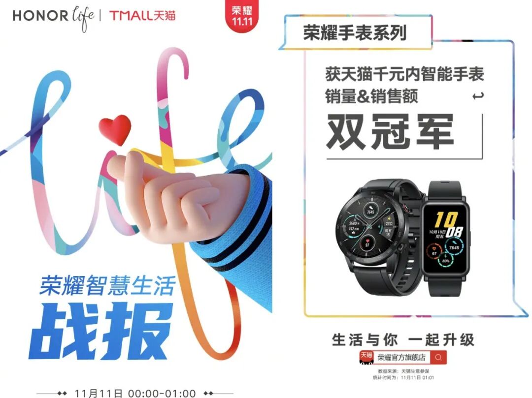 至于大家比较关心的华为荣耀,发稿前小白暂时未看到手机业务公布双十一战报,但是荣耀智慧生活表示荣耀手表系列获得天猫千元内智能手表销量&销售额双冠军(统计时间为11月11日0点-11月11日1点)