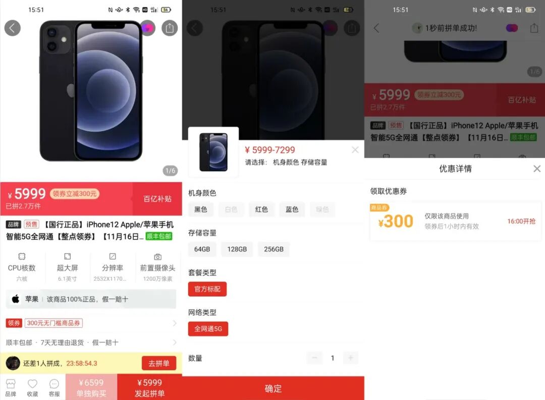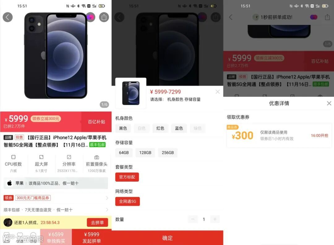 如上图所见,拼多多百亿补贴苹果专场iPhone 12 商品页面是5999元起,整点还可领取300元优惠券,最终相当于累计降价600元,5699元起即可到手,而苹果官网和京东天猫等平台仍是6299元起售。个人试了几次发现今天领券似乎比昨晚更容易一些。