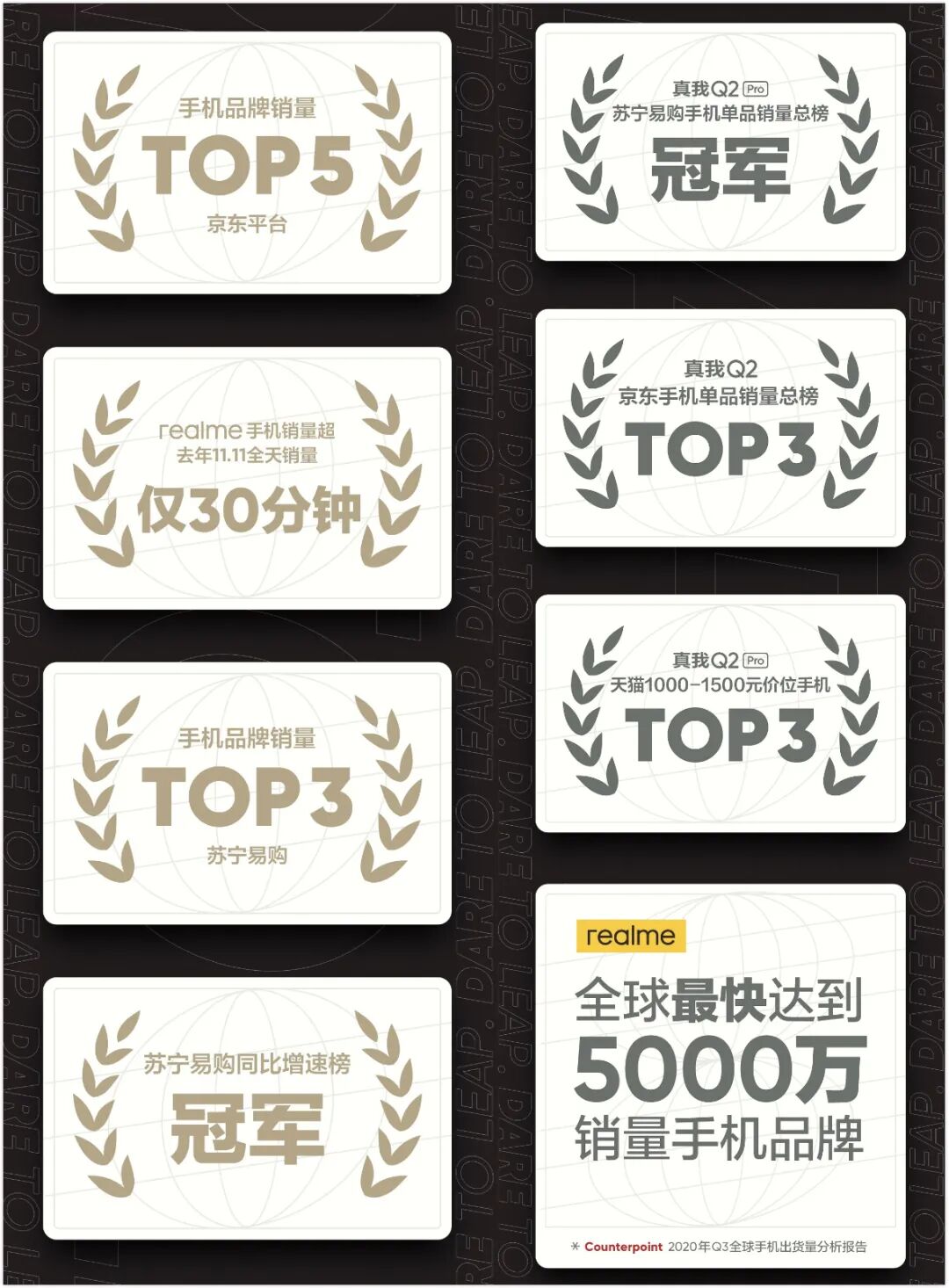 realme公布的战报则显示其是全球最快达到5000万台销量的手机品牌,手机品牌销量京东第5,苏宁第3,同比增速冠军,realme Q2 Pro获苏宁单品销量冠军等等(11月1日0点-11月11日1点) ;