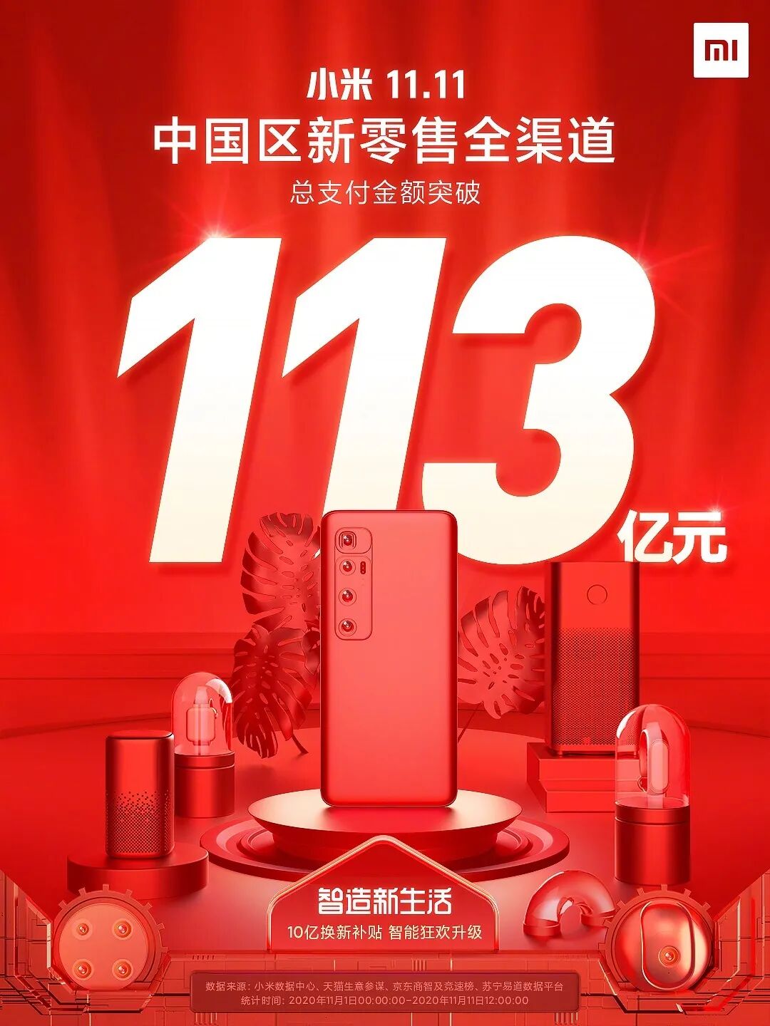 首先是小米官方公布的战报:小米双十一中国区新零售全渠道总支付金额突破100亿(数据统计时间为11月1日0点-11月11日3点25分)。