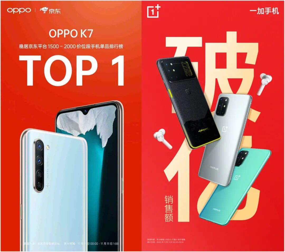 OPPO则稍微“简单”了点,只有单机型,OPPO K7稳居京东1500-2000价位段手机单品排行榜第一(统计时间为11月1日0点-11月11日1点);一加手机双十一战报销售额破亿元(统计时间为11月1日0点-11月11日0:15);