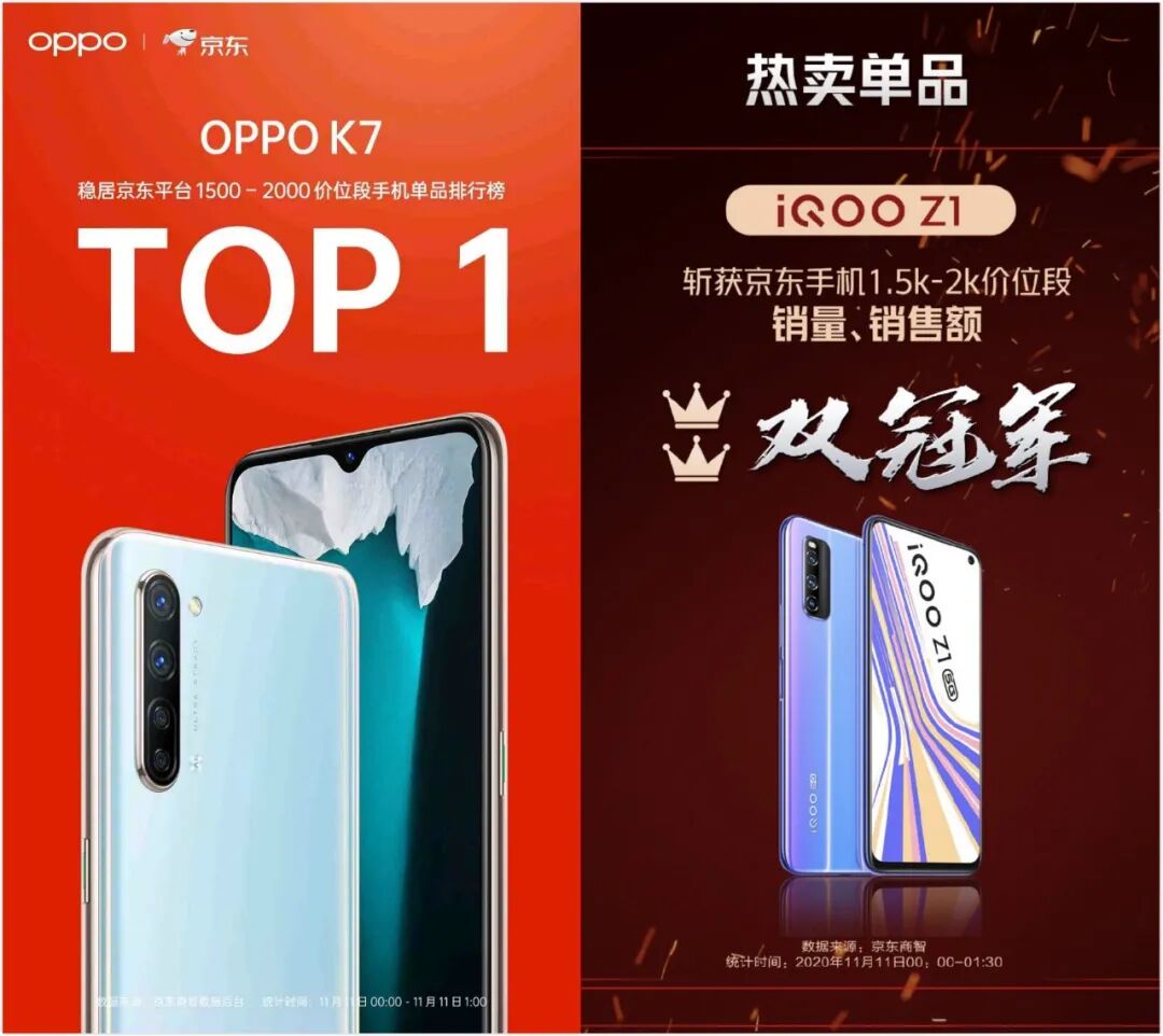 看到这里迷惑了,前面OPPO K7刚说自己是1500-2000 TOP1,咋iQOO Z1也是双冠军?看了下才发现OPPO K7的海报数据统计时间为11月1日0点-1点;而iQOO Z1是11月1日0点-1:30。