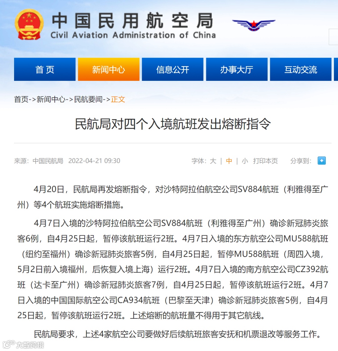 4月20日,民航局再发熔断指令,对沙特阿拉伯航空公司SV884航班(利雅得至广州)等4个航班实施熔断措施。