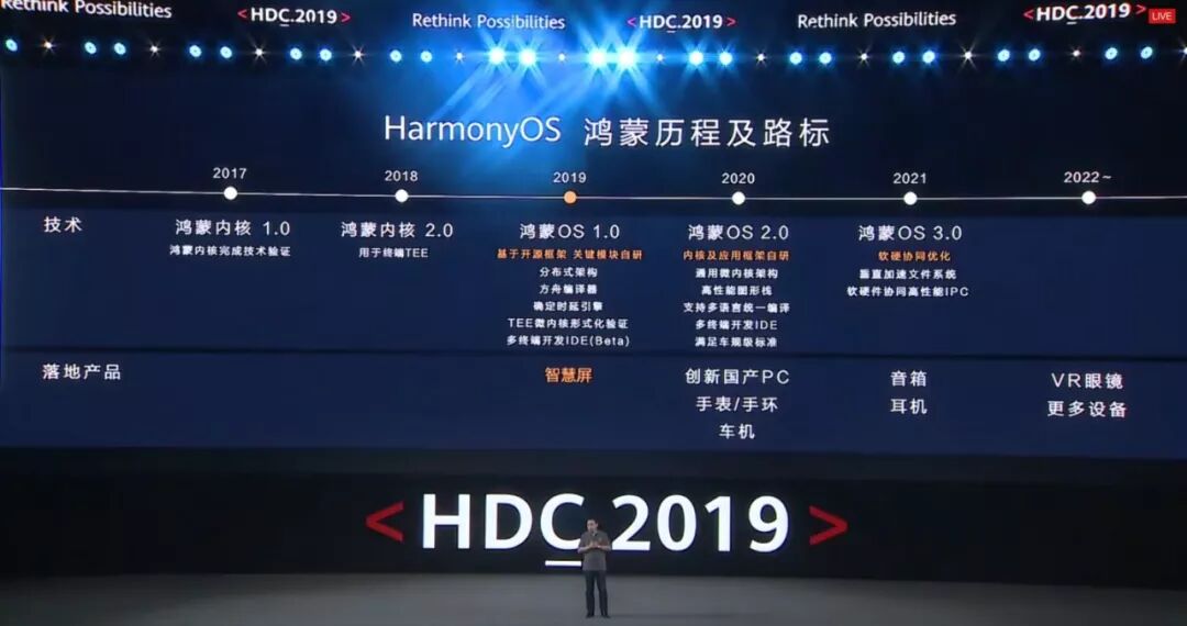 如上图所示,华为公布的鸿蒙OS的产品历程表示最早2017年完成了鸿蒙内核1.0的技术验证,落地产品由荣耀智慧屏8月10日首发,2020年国产电脑、智能手表、手环、车机将量产,2021年音箱耳机,之后还会有VR眼镜 等更多设备落地。