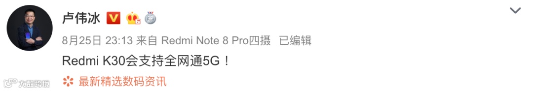 昨日晚间,高通骁龙发布了一款采用7nm工艺的5G芯片,没有意外的话应该会命名为SM7250/骁龙735。发布会Redmi卢伟冰也第一时间进行了转发,表示Redmi将是首批搭载的厂商,并对新旗舰Redmi K30进行了预热。