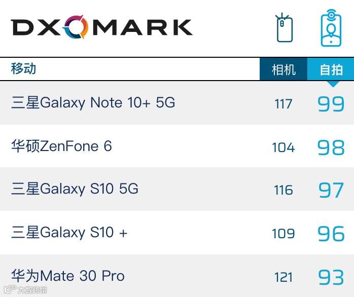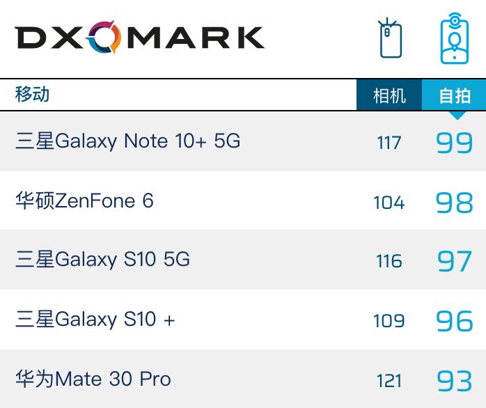 今年5月份截至三星Note 10系列发布前,DxOMark的前置相机榜一直被「华硕ZenFone 6」占据第一名,其凭借98分的综合成绩即使在三星Note 10+发布后也仍居第二。