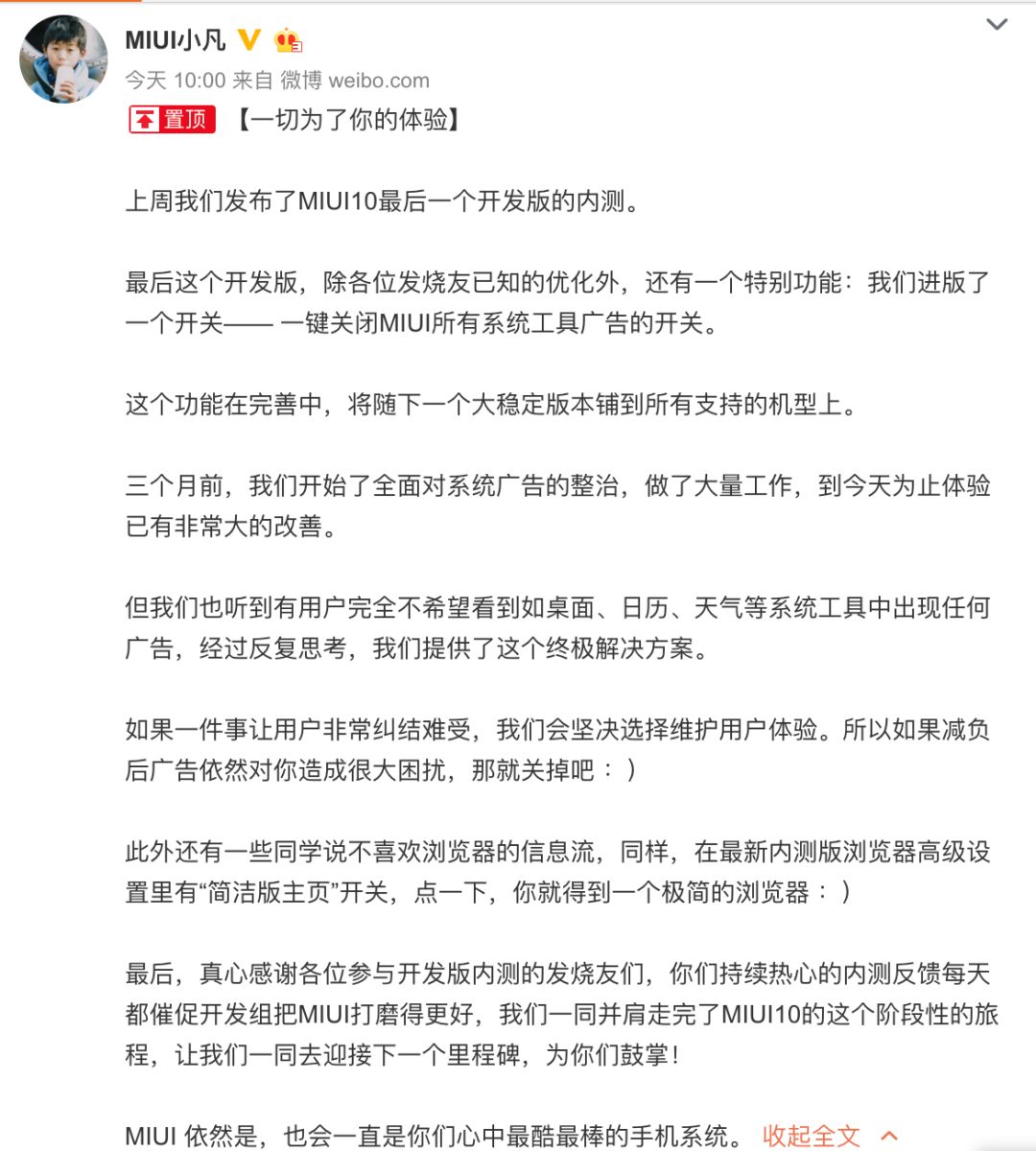 最后,今天还有一个好消息~在6月份小米MIUI负责人曾立下一个Flag:全面整治MIUI系统的所有低俗广告,三个月为期限,今日MIUI正式交出了一份应该会让用户满意的答卷~