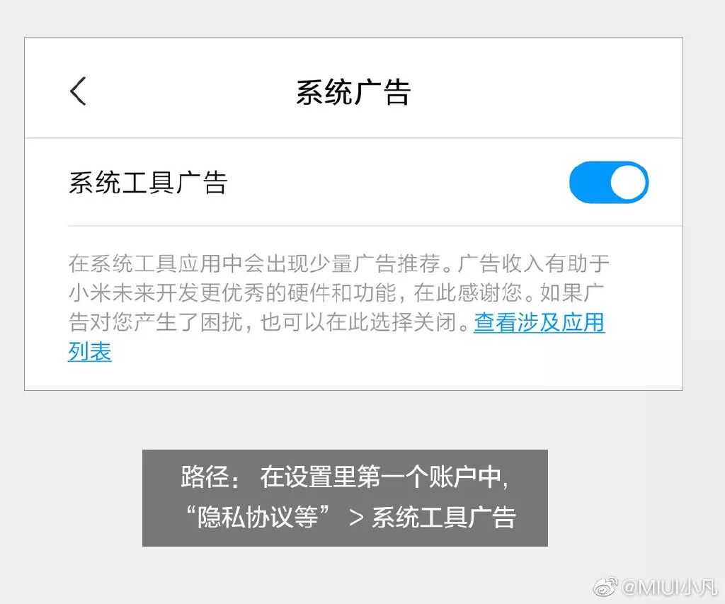 现在MIUI将上线一键关闭所有系统广告的开关选项,在「设置 - 小米账号 - 隐私协议 - 系统广告」即可关闭。