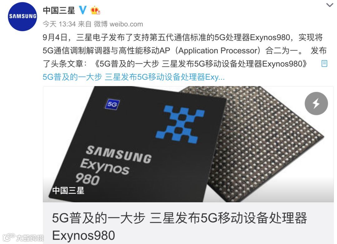 今天上午,三星电子发布了全新的5G芯片——Exynos 980,其也是三星旗下首款真5G SoC,集成5G通信调制解调器+高性能移动AP(Application Processor),刚好赶在 同样也是集成两者的真5G SoC麒麟990 前发布,命名还很巧妙的是980,真的是搞事情。