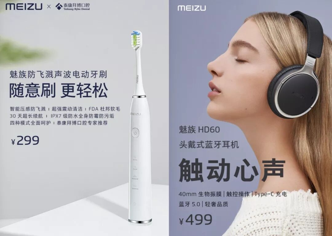 最后是魅族今天带来的几款配件类新品,①魅族头戴式蓝牙耳机HD60售价499元;②魅族防飞溅声波电动牙刷售价299元,刷头替换装59元。这俩目前已经开启预订,将于10月28日上午10点开售;