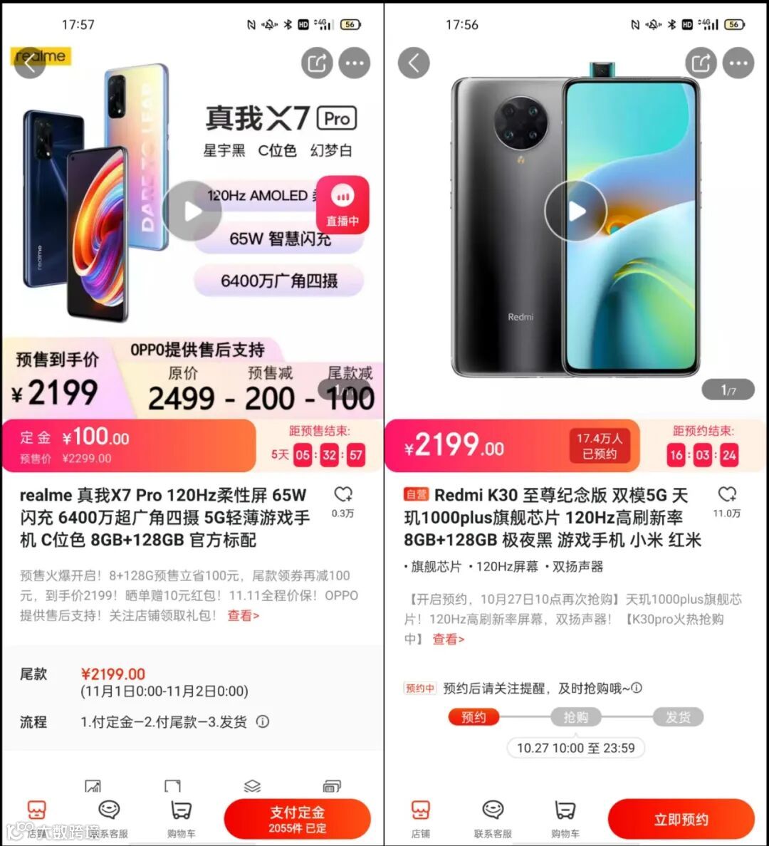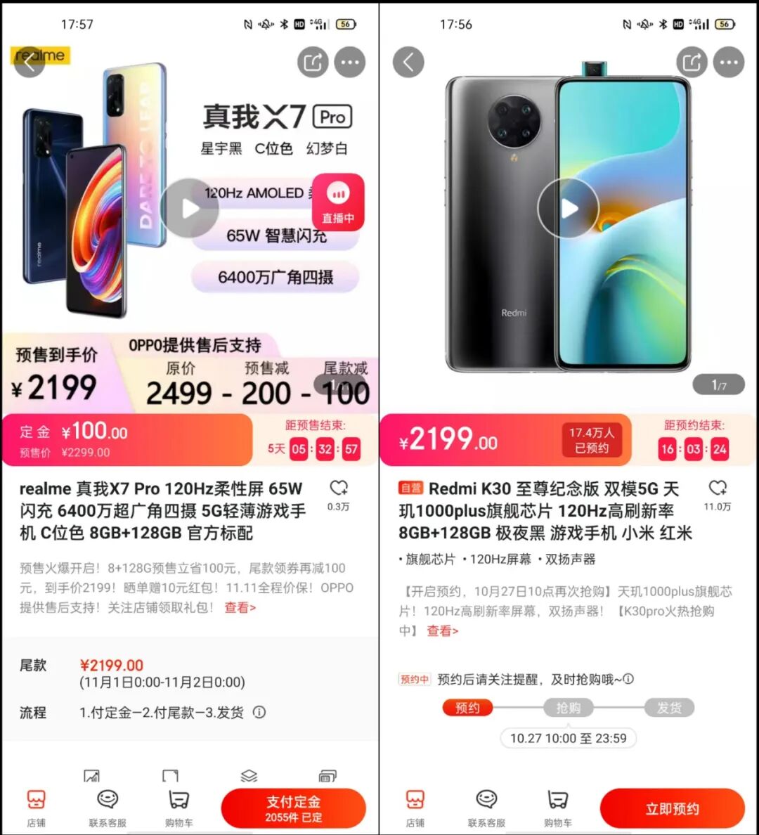 日前发布的realme X7Pro和Redmi K30 至尊纪念版两款机型一直被大家拿来比较,除了配置相似同样是天玑1000Plus+120Hz直屏外,备货也是差不多状态,都没现货,需要抢购,但现在realme X7 Pro不仅开启了双11预售活动 确保现货,还进行了首次降价。