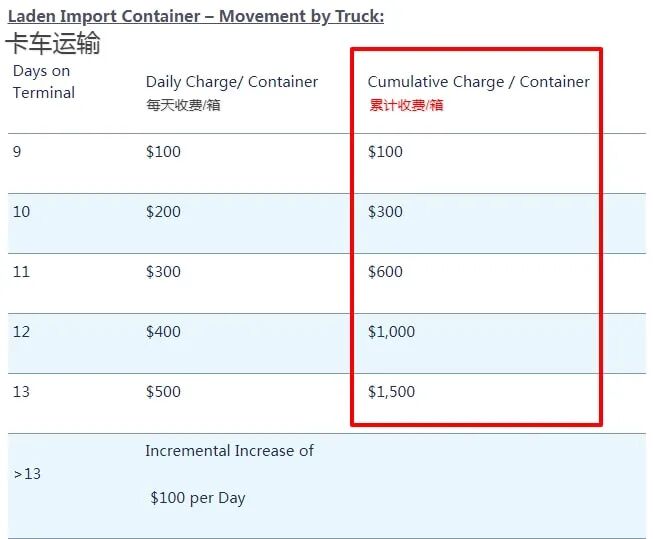 港口方面将从11月1日开始集装箱停留计算时间,从11月15日开始进行收费核算工作。请注意,这里的罚款并不是每一天每个柜交100美元,而是每一天增加100美元,在极端情况下,滞留一个月的柜子需要缴纳46500美元的天价罚款!