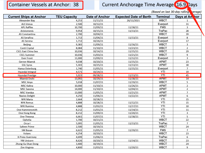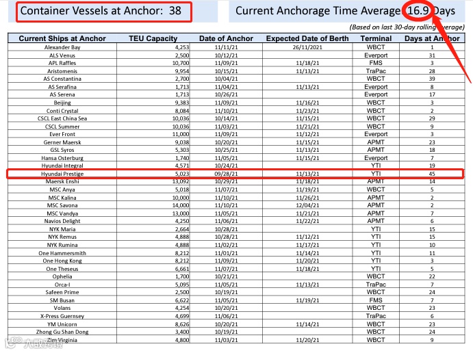 由于消费者对商品的需求激增,尽管政府努力加快集装箱的处理速度,但这两个港口仍然堵塞。据洛杉矶港signal平台11月11日的最新数据显示,目前光在洛杉矶锚地等待泊位的集装箱船就达到38艘,在港外等待的船舶达到7艘,平均等待靠泊时间激增至16.9天。一艘"Hyundai Prestige"的集装箱船已等待靠泊达45天。货量在第46周继续增长。