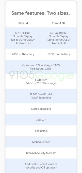 随着新iPhone、华为等新旗舰的发布,谷歌的新旗舰Pixel 4系列也到了最后的爆料时刻,近日有外媒曝光了一份Pixel 4系列的官方规格说明书,其核心配置和真机渲染图均有流出。