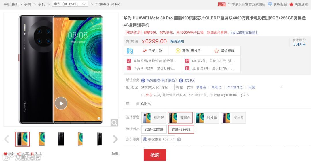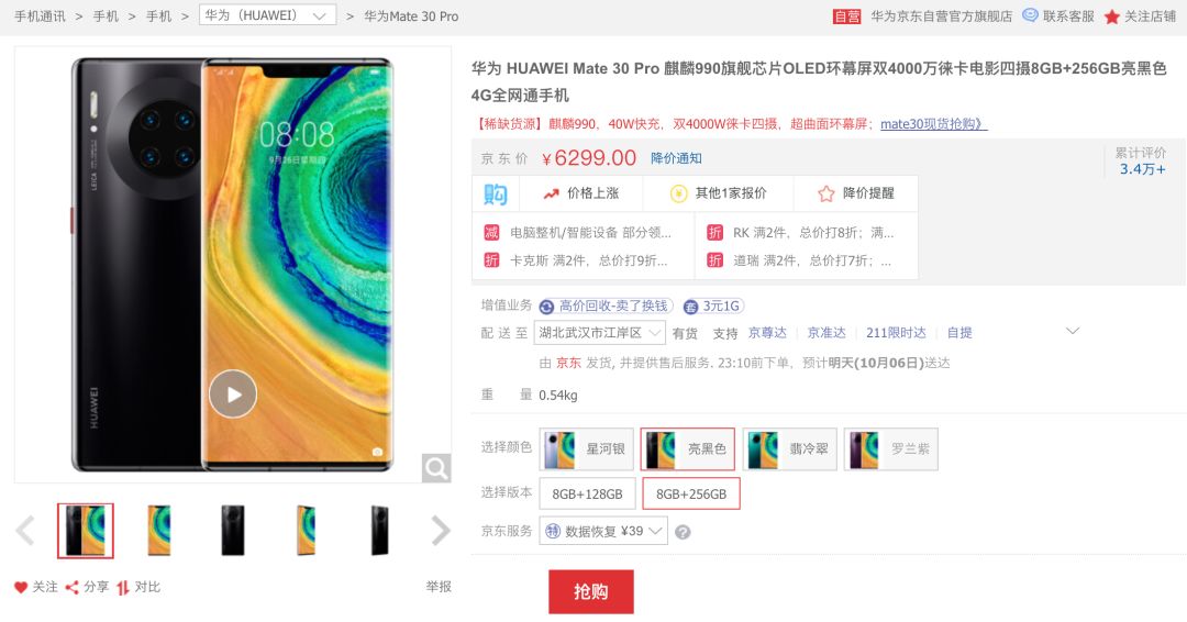 小白今天上午在京东自营平台查询时,华为Mate 30 Pro星河银和亮黑色2个配色全系均可现货购买,但发稿时查询的结果是,无论华为商城还是京东自营,Pro只有亮黑色现货,其他3个配色则需要预约,京东平台将于明天加购,预计20天内发货。