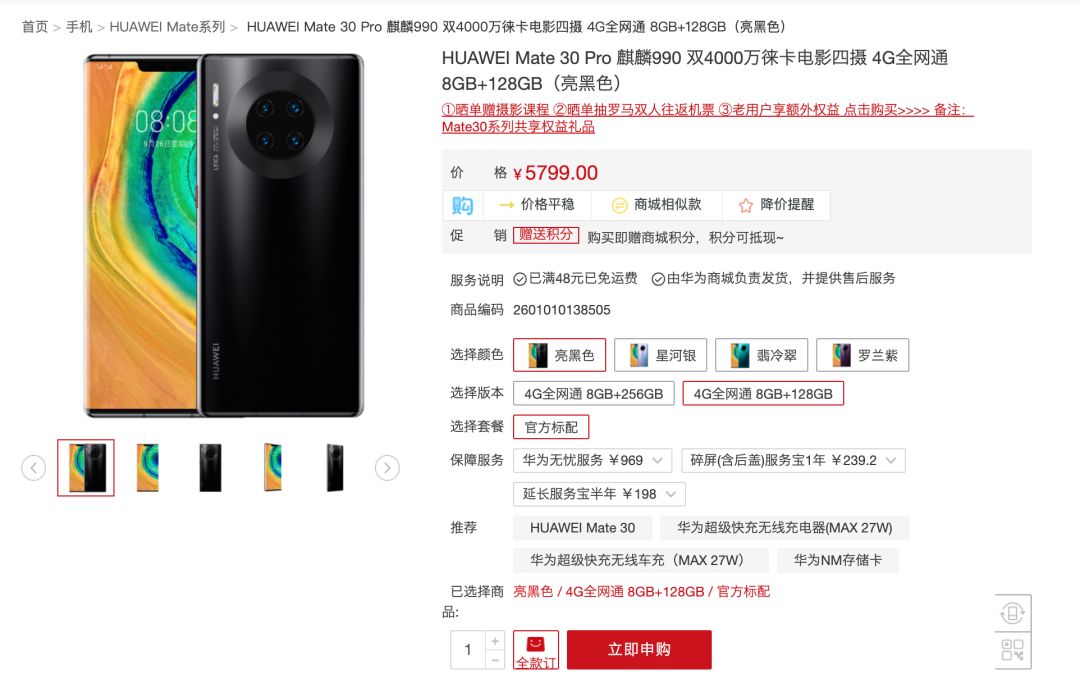 至于价格,华为Mate 30 Pro:8+128GB售价5799元,8+256GB售价6299元;Mate 30 Pro 5G版8+256GB售价6899元,8+512GB售价7899元,5G版将于11月1日上午10:08开卖,华为Mate 30 RS保时捷设计同样支持5G,12+512GB售价12999元,其将于11月10日上午10:08开售。
