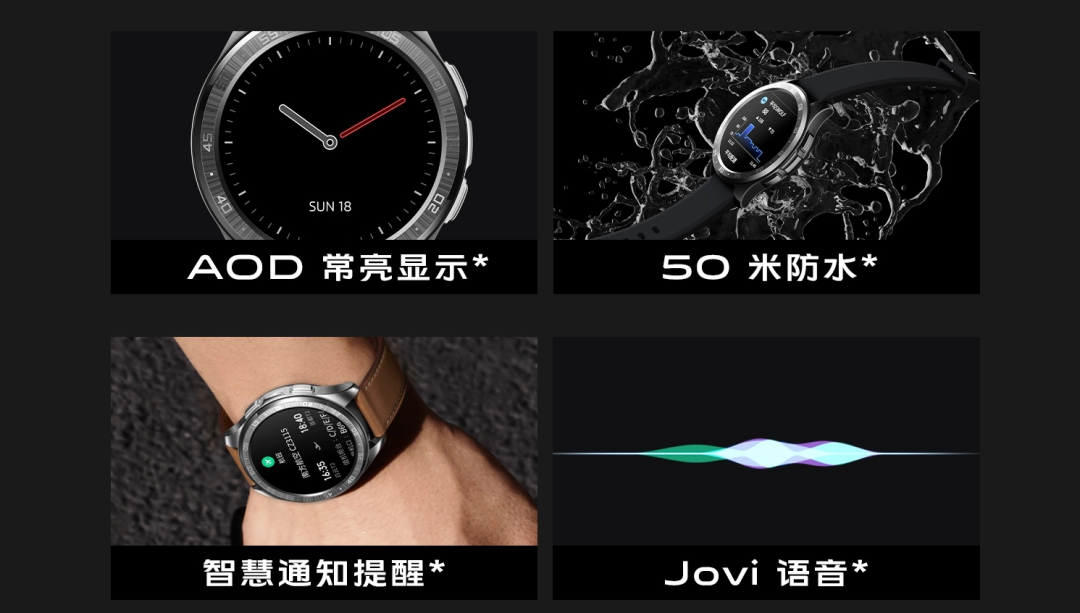 功能上,vivo Watch支持全天候连续血氧饱和度监测、全天候心率监测、睡眠监测、压力监测、深呼吸放松,支持全天候卡路里消耗监测及目标设定,支持多项运动模式,支持蓝牙5.0播放音乐,NFC公交门禁,支付宝支付等,内置Jovi语音助手,兼容其他安卓手机,支持同步日程和消息提醒。